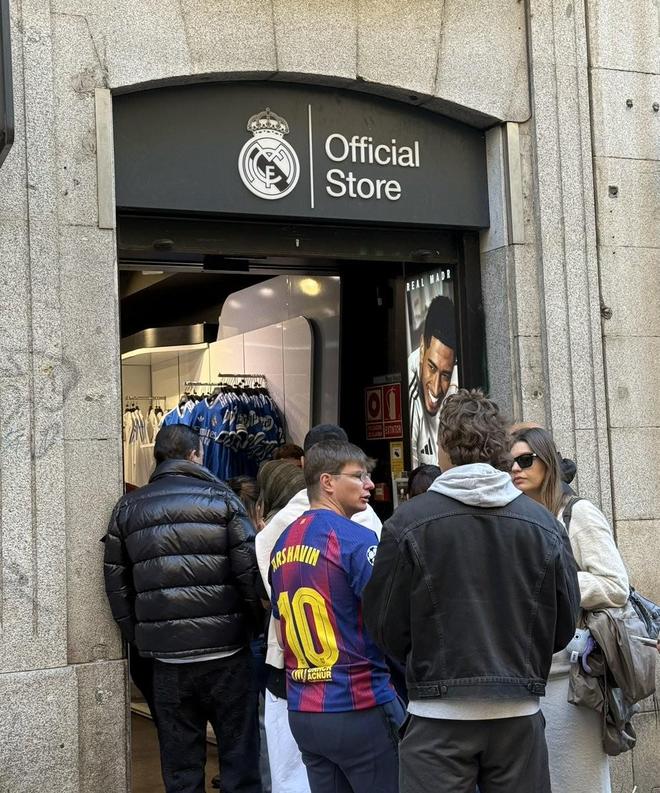 阿尔沙文身穿的巴萨球衣上印着自己的名字,而号码则是10号,照片拍摄于皇马官方商店门口。