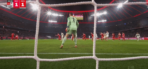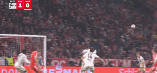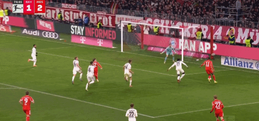 第45+2分钟,伯温开出任意球,波图尔斯基头球破门,美因茨1-1拜仁